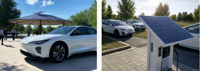출근길, 자동차 키를 찾을 필요가 없다. 전기차가 밤사이 자가 충전 스테이션에서 배터리를 채웠고, 스마트폰으로 호출하면 차고에서 스스로 나와 대기한다. 도로를 달리는 동안, 차량의 지붕에 장착된 태양광 패널이 추가로 전력을 생산하며 달린다. 도심 곳곳에는 풍력 발전기가 바람을 에너지로 바꾸고, 버려지는 에너지는 초고효율 배터리에 저장된다.