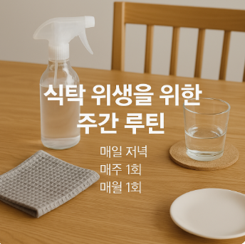 식탁은 매일 닿는 공간인 만큼, 위생 관리도 매일·매주·매월의 리듬을 정해두고 실천하면 훨씬 수월해집니다. 다음은 식탁 위생을 위한 주간 루틴 예시입니다. 다음과 같이 위생 루틴을 정해두면 그때그때 번거롭게 느껴지는 청소가 훨씬 덜 부담스럽고, 생활 속 습관으로 자리 잡기 쉽습니다.