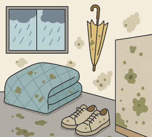 곰팡이는 습도와 온도가 높고 통풍이 잘 안 되는 환경에서 번식합니다. (습도 70% 이상, 온도 20~30도 사이, 공기 정체 또는 밀폐된 공간) 장마철의 한국 날씨는 이 조건을 완벽하게 충족합니다. 게다가 건조가 어려워진 이불, 젖은 신발, 벽의 결로 현상 등은 곰팡이 번식을 촉진하는 요인으로 작용합니다. 우리가 매일 사용하는 생활용품들이 곰팡이의 온상이 되는 이유입니다.